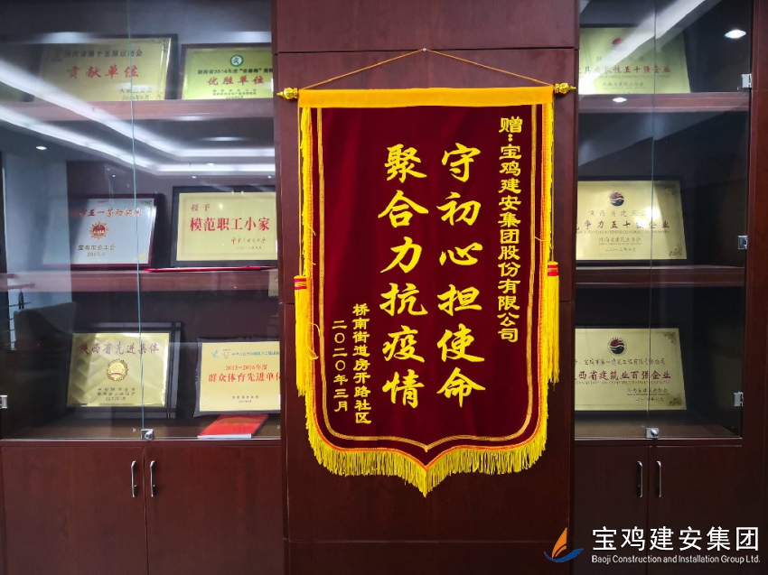 4月1日上午,寶雞建安大廈21樓舉行了一場(chǎng)簡(jiǎn)單而熱烈的贈(zèng)旗活動(dòng)。橋南街道辦事處房開路社區(qū)馮書記、王主任等三人代表社區(qū)所管轄的廣大居民,給寶雞建安集團(tuán)股份有限公司送來一面“守初心擔(dān)使命、聚合力抗疫情”的錦旗,贊揚(yáng)寶雞建安集團(tuán)公司在新冠肺炎疫情防控工作中對(duì)社區(qū)工作的支持和幫助。公司黨委書記、總經(jīng)理、工會(huì)主席等參加活動(dòng)。