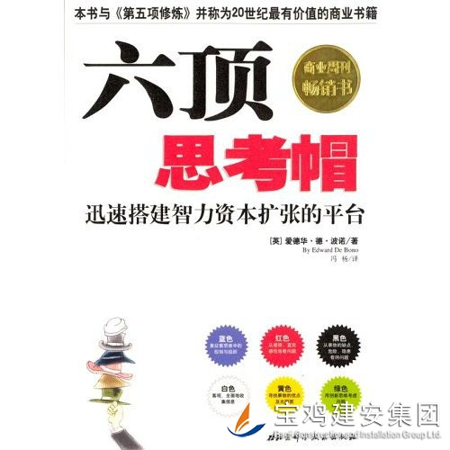 《六頂思考帽》是著名的英國創(chuàng)新思維家愛德華.德.博諾的作品,它通過六種不同顏色詮釋了六種不同的觀點。六頂分別是每個人都認識:藍、白、紅、黃、黑、綠這六種不同的顏色,之所以叫思考帽,是形象地讓人更容易理解和接受,也能夠想象到自己戴上或摘下不同顏色帽子的感受。 藍帽:觀察和管理思考。藍帽負責控制各種思考帽的使用順序,它規(guī)劃和管理整個思考過程,并負責做出結論。