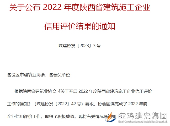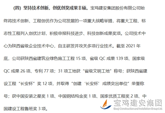 通報(bào)文件第二部分對(duì)參評(píng)企業(yè)特色及亮點(diǎn)進(jìn)行了點(diǎn)名評(píng)述,其中第四版塊“堅(jiān)持技術(shù)創(chuàng)新,創(chuàng)優(yōu)創(chuàng)獎(jiǎng)成果豐碩”一欄,對(duì)我司進(jìn)行了專門評(píng)介:“寶雞建安集團(tuán)股份有限公司始終將技術(shù)創(chuàng)新、工程創(chuàng)優(yōu)作為公司發(fā)展的一項(xiàng)重大戰(zhàn)略舉措,將重大工程、標(biāo)志性工程列入創(chuàng)優(yōu)計(jì)劃,積極申報(bào)科技進(jìn)步、科技創(chuàng)新成果獎(jiǎng)項(xiàng)。公司技術(shù)中心為陜西省級(jí)企業(yè)技術(shù)中心,自主研發(fā)并攻關(guān)多項(xiàng)行業(yè)技術(shù)。截至2021年底,公司獲陜西省建筑業(yè)綠色施工工程15項(xiàng)、省級(jí)QC成果139項(xiàng)、國(guó)家級(jí)QC成果26項(xiàng)、專利77項(xiàng);31項(xiàng)工地獲“省級(jí)文明工地”稱號(hào);獲陜西省建設(shè)工程“長(zhǎng)安杯”獎(jiǎng)12項(xiàng),并取得“創(chuàng)建‘長(zhǎng)安杯’成績(jī)突出單位”榮譽(yù)稱號(hào);獲中國(guó)安裝之星獎(jiǎng)1項(xiàng)、中國(guó)鋼結(jié)構(gòu)金獎(jiǎng)1項(xiàng)、國(guó)家優(yōu)質(zhì)工程獎(jiǎng)2項(xiàng)、中國(guó)建設(shè)工程魯班獎(jiǎng)3項(xiàng)?!?/span>